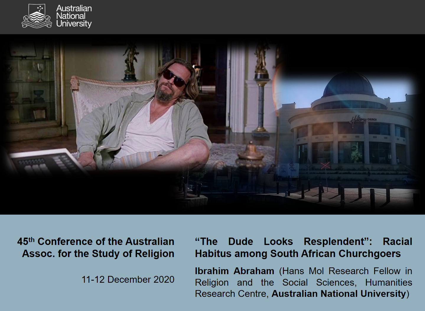 (69) “’The Dude Looks Resplendent’: Racial Habitus among South African Churchgoers.” 45th Annual Conference of the Australian Association for the Study of Religion. Online. 11-12.12.2020.